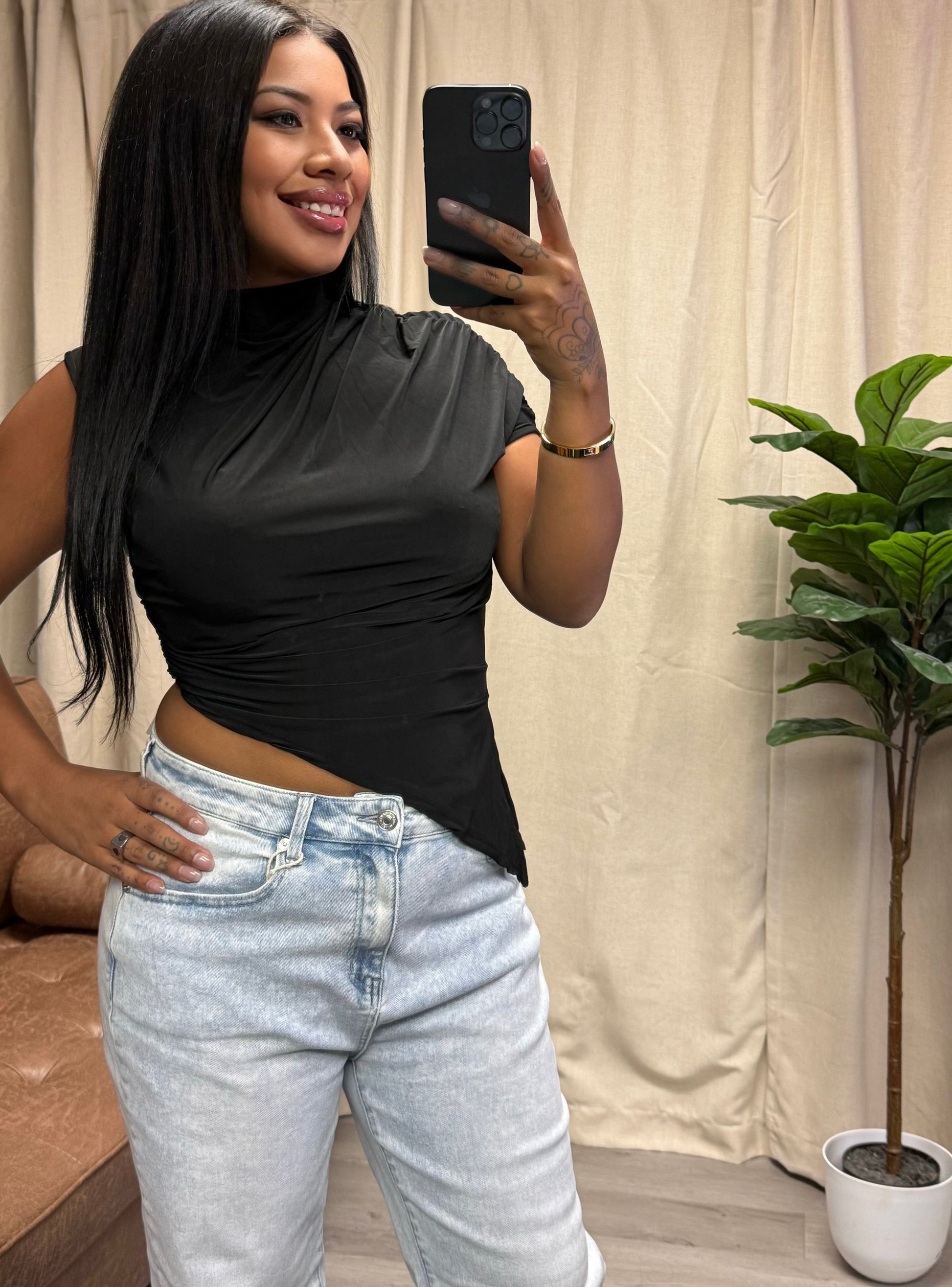 A sleek, asymmetrical black top featuring a mock neckline, cap sleeves, and a draped, body-hugging silhouette. The side ruching detail creates a flattering fit, while the angled hemline adds a modern, edgy twist.