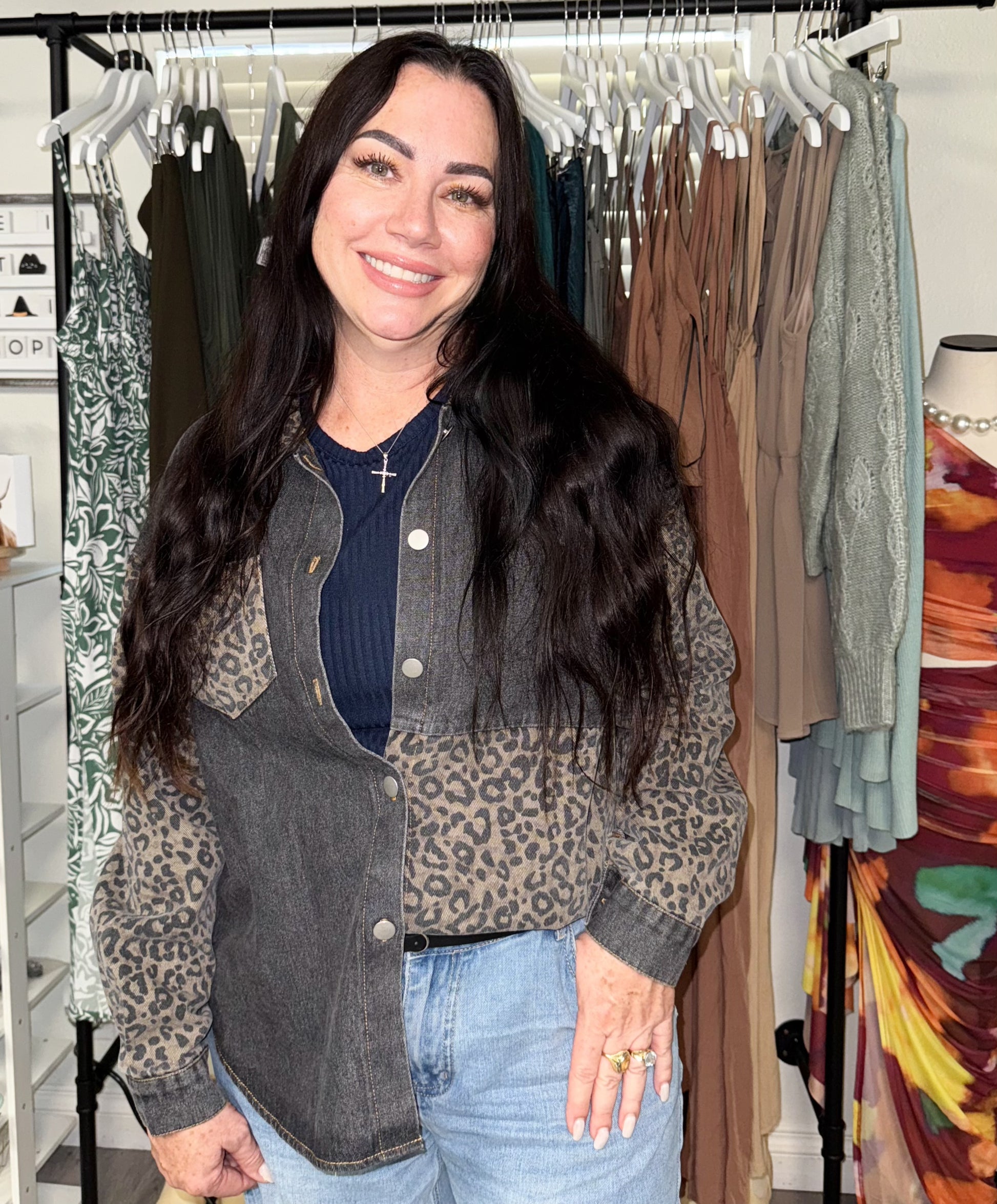 Unleash your bold side with a washed black denim beauty with fierce cheetah detailing. This statement piece combines that perfect worn-in feel with an untamed twist, giving you a look that’s both edgy and effortlessly cool. Pair it with your favorite jeans for a double-denim vibe, or throw it over a dress for that wild, street-chic finish. It’s the ultimate blend of sass, style, and attitude.
